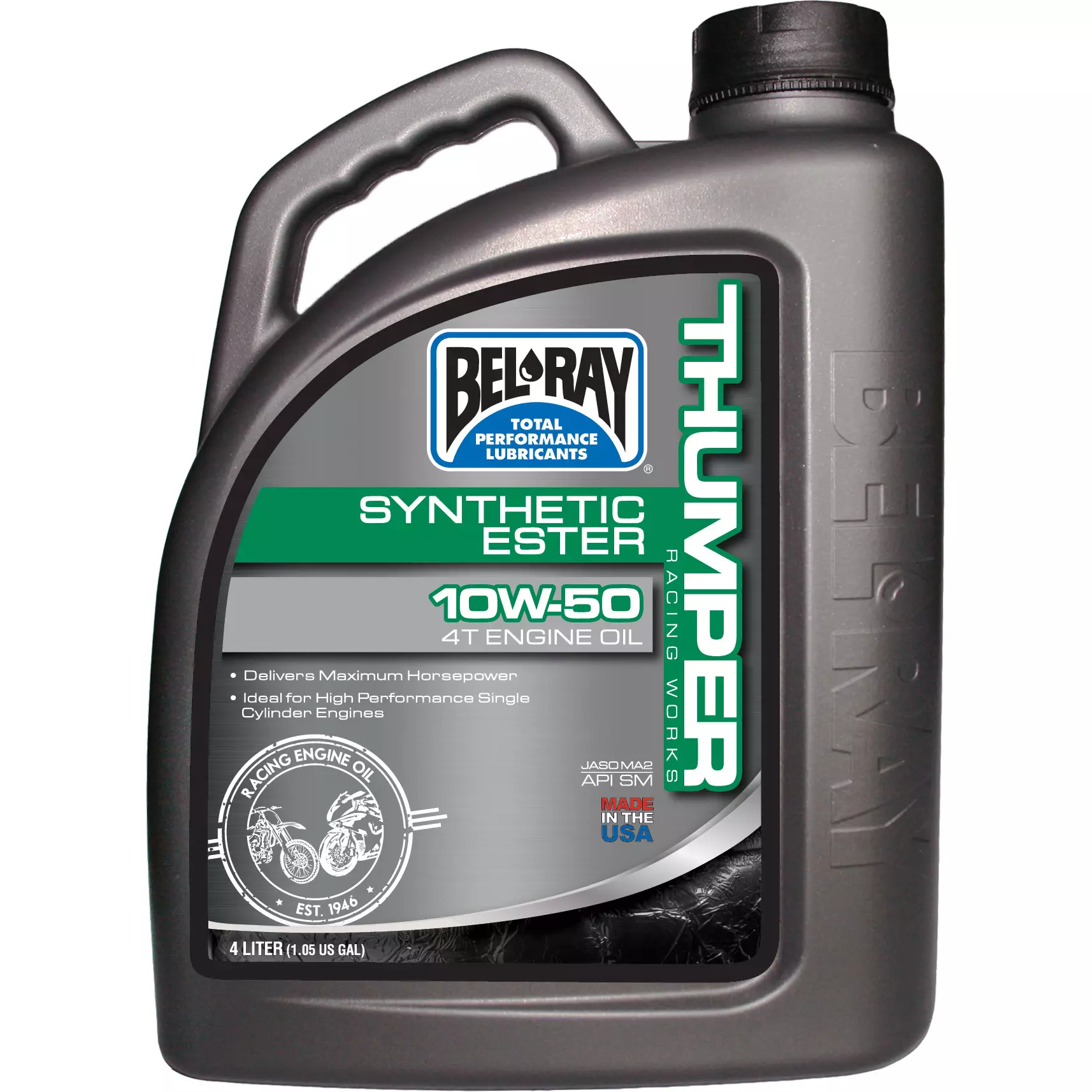 Bel-Ray Thumper Racing Works Synthetic Ester 4T Engine Oil on 4-tahtimoottoripyörille tarkoitettu täyssynteettinen kilpaöljy, joka on kehitetty täyden kilpakäytön vaatimuksiin ja suunniteltu kestämään äärimmäisiä kilpailuolosuhteita. Täyssynteettiset esteriperusöljyt kestävät korkeimmat lämpötilat ja rasitukset ja tarjoavat suorituskyvyn 4-tahtimoottoripyörille. Täyttää API SN ja JASO MA2 -vaatimukset. Sopii ilmajäähdytteisille/nestejäähdytteisille 4-tahtimoottoreille ja märkäkytkimille.